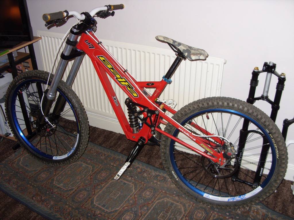 The missing decals will be replaced this winter after i've had it powdercoated (it's just spraypaint on it now) Spec: Balfa BB7 with Vivid 5.1 Pushed Rs Boxxer Team, sunline DM stem (no good fork, wouldn't recommend it) Deemax Hone cranks on the pic, now they are replaced with Saint Shimano Xt brakes with Goodridge The saddle is an old hucking-sofa i got with the frame, and took away the padding. Will be replaced when i have too much money and too little t spend the money on  It works good for the moment. Just the estethical bit. Nokian Gazza tyres (but now for the messy fall and winther there are wetscreams on) A modded LG1 chainguide XTR gears with XTR gearshifter Except the troubles with the fork, it's the most dialled bike i've ever ridden. Wouldn't trade it for anything.
