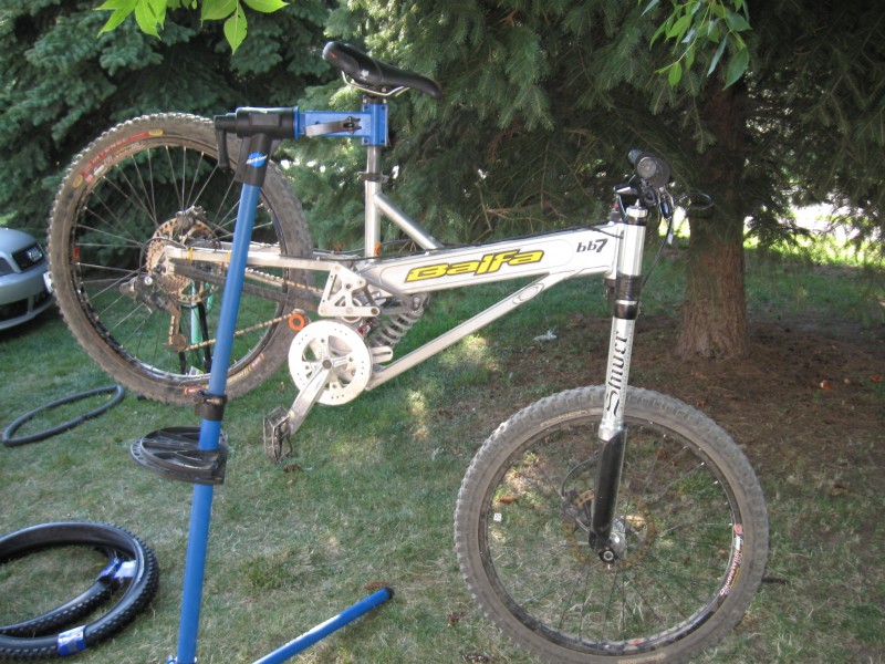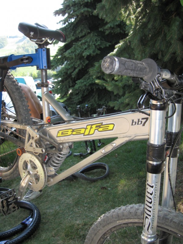 Here is some pictures of my ride before and after its new rebuild Before   After   Specs Frame :Balfa BB7, medium (2003?) Fork: 2009 Fox 40 (new lowers and matching decals comming, also going to lower it to 7") Shock: Some old Vanilla RC, have a Vivid but that fucker is busted and needs service Wheels: Mavic 721 with Nuke Proof hubs (intense tyres) Brakes: Formula The Ones Gear: Sramx9 Cassette : Sram pg970 (road) Seatpost: Nukeproof Saddle: The Icon Stem: Point1 Racing (split second) Bar: NukeProof Headset: NukeProof Pedals: NC17 Crankarms: Some old Roox (upgrading nextyear) Got a fresh black powdercoat forthisseason Also had the dude over at http://slikgraphics.com/ hook me up with new decals and they are the BOMB!